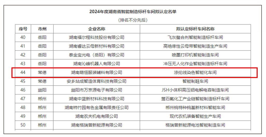 為貫徹落實(shí)黨的二十大關(guān)于“推動(dòng)制造業(yè)智能化發(fā)展”的決策部署,縱深推進(jìn)“智賦萬(wàn)企”行動(dòng),加快發(fā)展新質(zhì)生產(chǎn)力,湖南省工業(yè)和信息化廳于近日公布了認(rèn)定的14家智能制造標(biāo)桿企業(yè)和60個(gè)智能制造標(biāo)桿車間。其中,湖南萌恒服裝輔料有限公司所屬滌綸線染色智能化車間獲批認(rèn)定為湖南省智能制造標(biāo)桿車間。