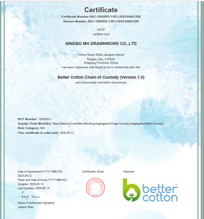 5月14日,萌恒抽紗成功通過良好棉花倡議(Better Cotton Initiative, BCI)驗廠,標志著公司在可持續棉花供應鏈管理方面取得了重要進展。BCI作為全球最大的可持續棉花種植項目,致力于推廣棉花產業的可持續發展,通過規范種植方式、降低環境破壞、保障勞動者權益,使良好棉花成為全球主流的大宗商品。 Physical BCI是實現全供應鏈實物溯源的重要舉措,旨在從源頭到終端全程監管良好棉花的流通。目前,生產商可從13個國家采購良好棉花,且在2025/26棉花季澳大利亞、巴西和以色列等國也將供應良好棉花。參與Physical BCI的企業需建立并維護書面的BCI管理體系,保存完整的生產銷售記錄,并在規定時間內完成平臺數據追溯。這一嚴格的監管機制不僅規范了棉花操作方式,也為企業提供了更高效、透明的供應鏈管理工具。 萌恒抽紗此次通過BCI驗廠,不僅體現了我們對可持續發展理念的堅定承諾,還意味著我們將在更多市場中獲得合作契機,為后續業務開拓奠定堅實基礎。目前全球已有300多家零售商和品牌加入 BCI,萌恒抽紗也將借助這一東風,秉持可持續發展理念,提升品牌競爭力,同時為全球棉花產業的綠色轉型貢獻力量。
